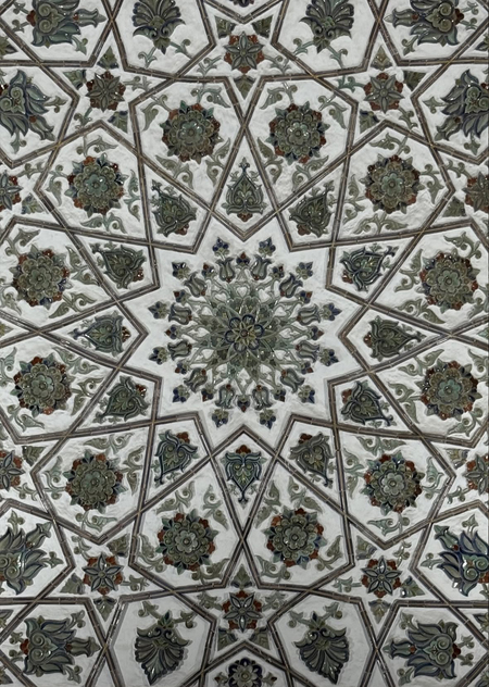 Здесь орнаменты, которые больше всего напоминают что-то восточное. Строгость, симметрия, схожесть с элементами на медресе. Сетчатая геометрия, формы звёзд, очертания крупных цветов. За основу цветовых решений как-будто взяты цвета узбекского флага, подчёркивая связь с государственной символикой и патриотизмом.