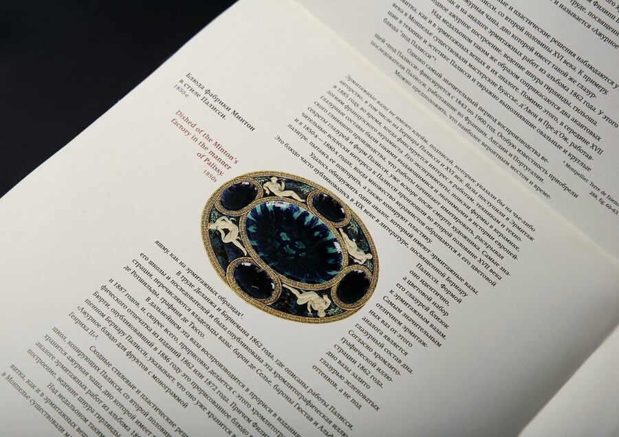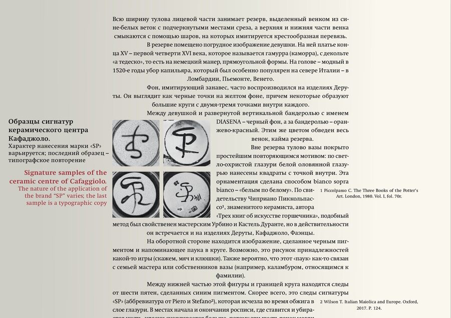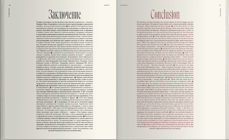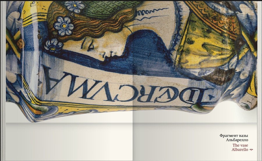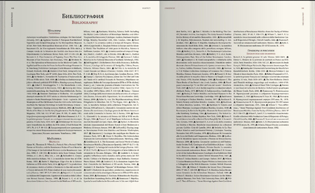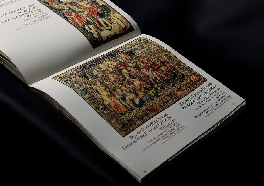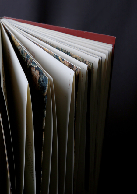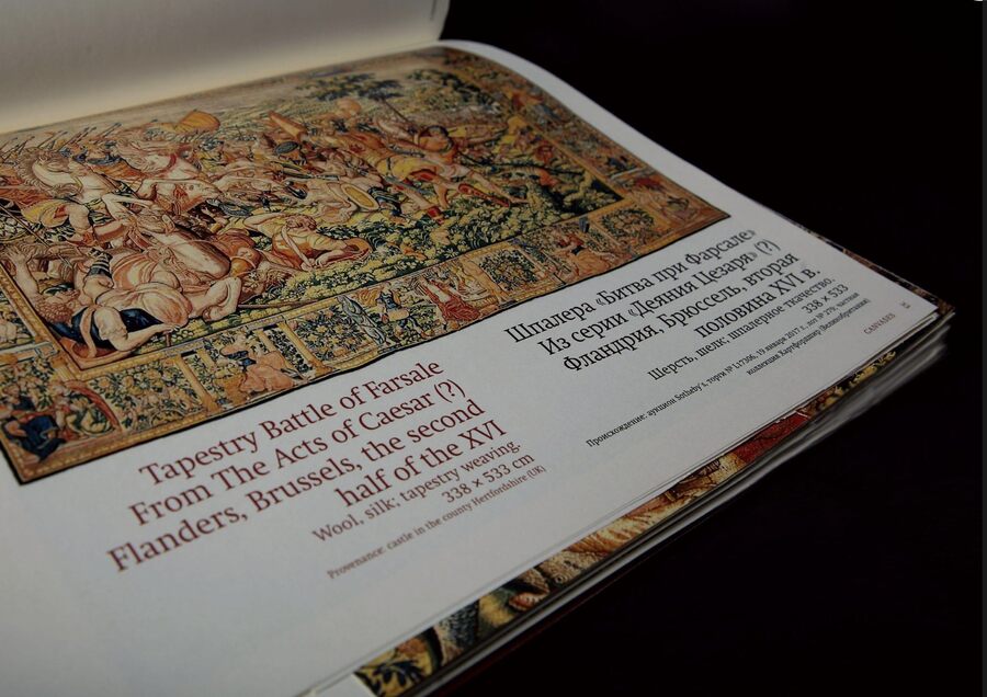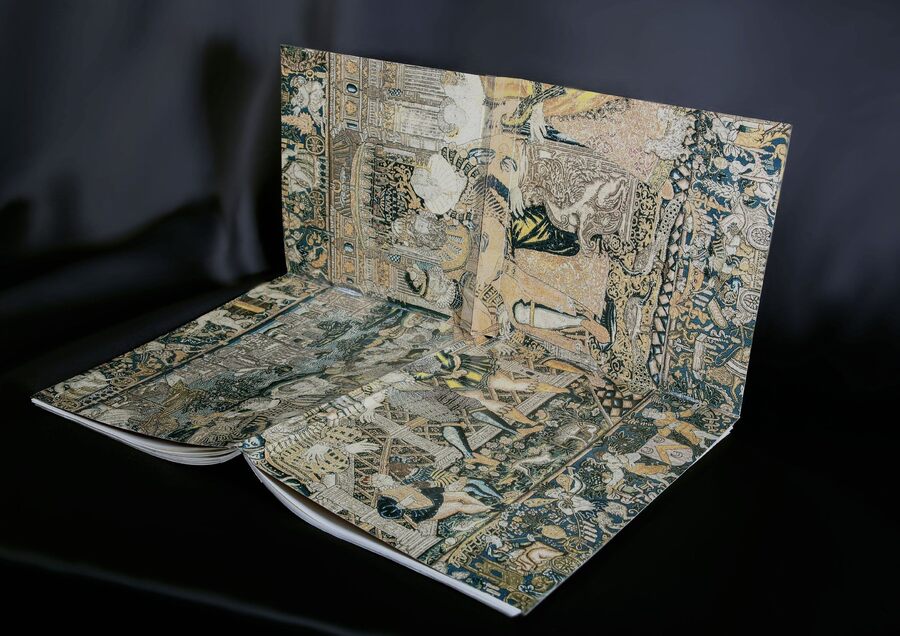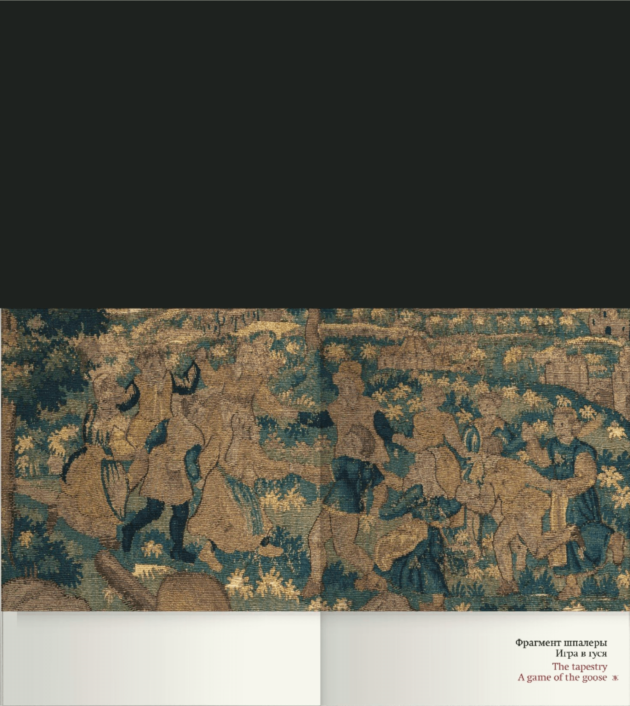 Особенность макета книги заключается в том, что основообразующая метафора поддерживается и в конструкции книги (меняется ориентация чтения). Чтобы поддержать грандиозность и материальную пластичность шпалерных полотен, в книге сделаны вертикальные клапаны.