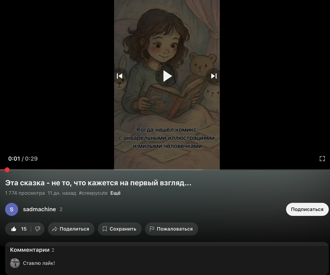 Исходя из текущих визуальных трендов (аналоговый хоррор, эстетика «creepy cute», «ожидание vs реальность»), нейросеть предложила мне разработать сценарий короткого видео по мотивам Beautiful Darkness, превращая его сюжет в чёрную комедию или драматическую метафору о работе и жизни. Был использован контраст между милой эстетикой и мраком — это создает эмоциональный крючок. ИИ помог создать сюжетную структуру с учётом времени удержания, темпа, визуальных и звуковых триггеров, помог не только с идеей, но и с оформлением видео.