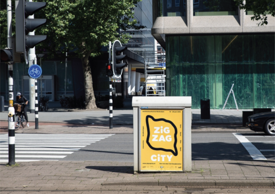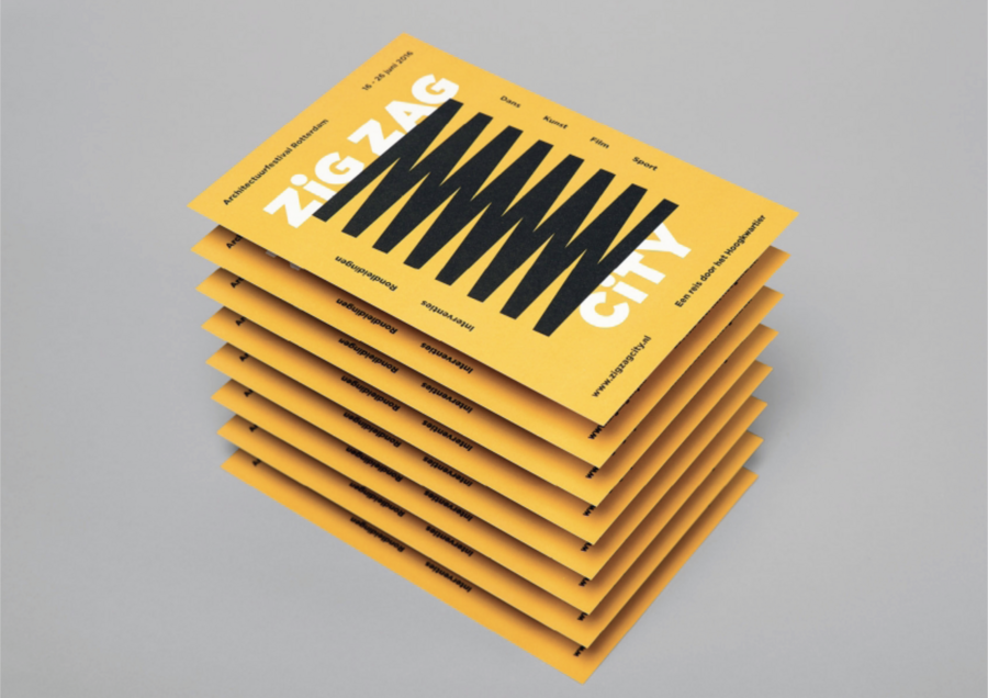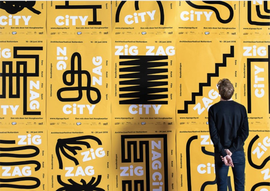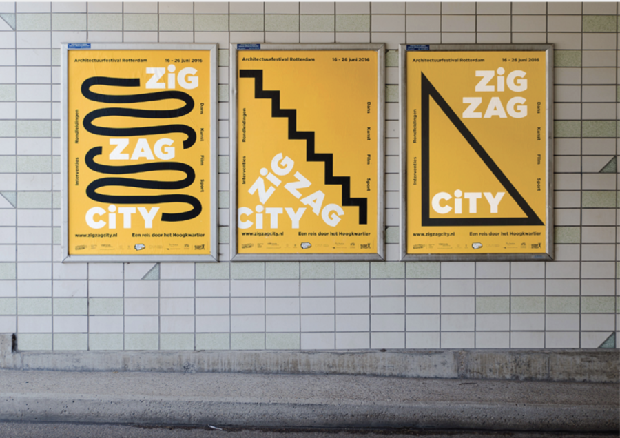 Проект Zig Zag City для архитектурного фестиваля в Роттердаме (2016) включает яркие постеры с игривой типографикой и черными зигзагообразными линиями на желтом фоне. Визуальный стиль отражает динамичную атмосферу города и фестиваля, акцентируя внимание на разнообразии маршрутов мероприятий. Проект разработан дизайнерами студии Pentagram.
