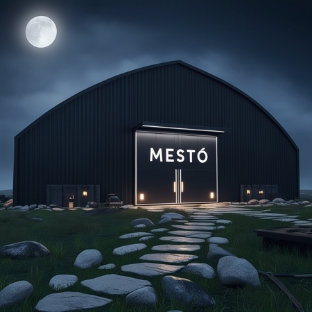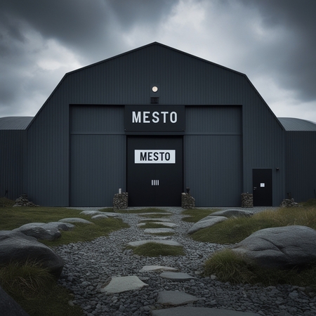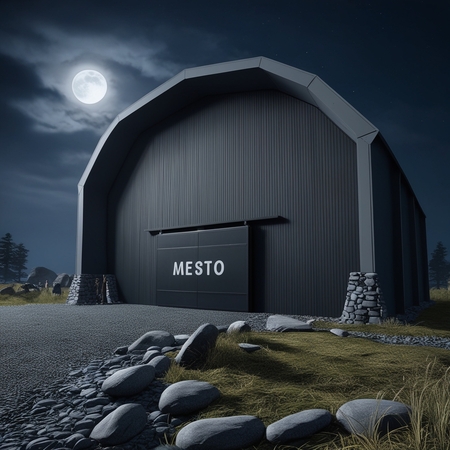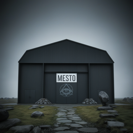 Create a dark large hangar in gray for a quest room. It is located in a place remote from people. Stands on stones and grass. It’s dark all around. Hangar colors black. Eyes are drawn on it. There’s a huge sign on the door «Место», font din condensed.