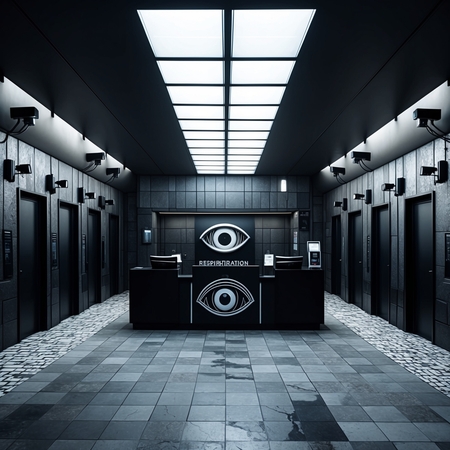 Create the interior of a lobby quest room with black and white shades. There are surveillance cameras on the walls. Lots of doors and a large reception desk in the center. There is a large eye behind the registration desk. There are tiles on the floor, and the area of the room is elongated, as if there is no end in sight.