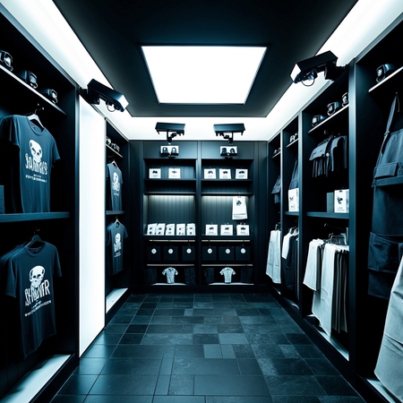 Create the interior of a souvenir shop. Black walls, there are video surveillance cameras on them. There is a white backlight everywhere. Shelves with products are also highlighted. They have black T-shirts, shoppers and aprons hanging on them. Black floor and tiles. A frightening horror-style atmosphere.