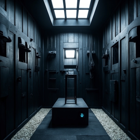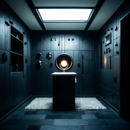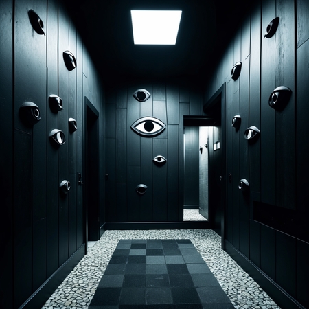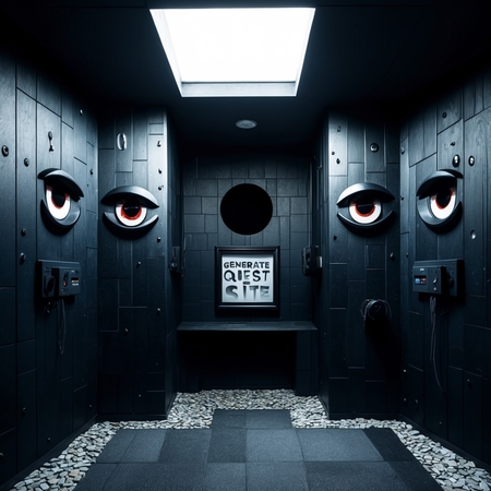 Generate a space for the quest site. Everything is in black, the room is in darkness and nothing is visible. There are eyes on the wall. There is a backlight somewhere. The atmosphere of horror.