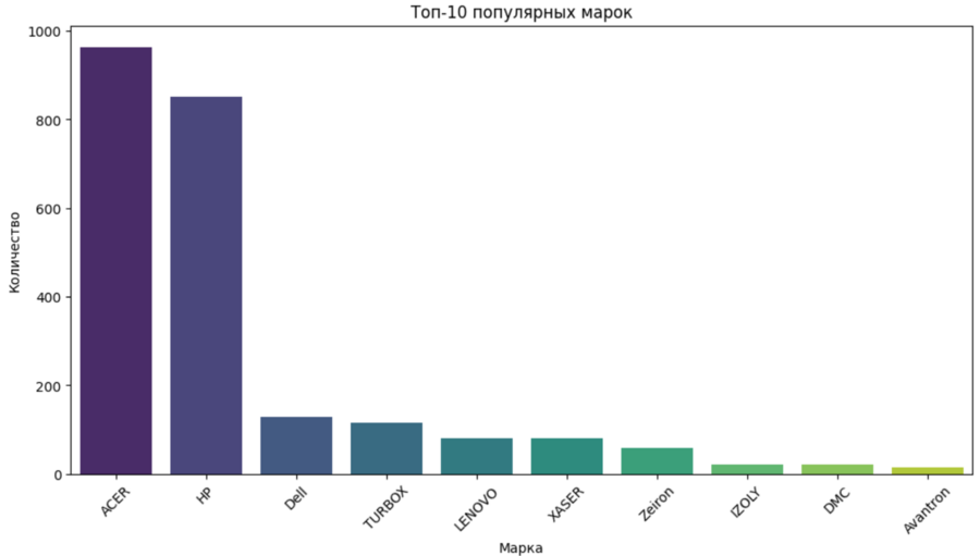 Как видно на гистограмме «Топ-10 популярных марок», самой популярной является ACER, что не удивительно, ведь действительно множество различных предложений под этой марки в районе 40000, а как известно это самый популярный ценовой сегмент.