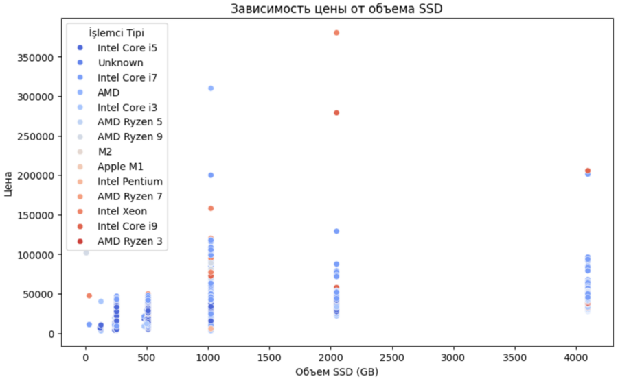 Несмотря на то, что обычно объём и общее количество жёстко коррелирует с ценой, здесь же можно заметить, что ситуация не совсем такая. Самые большие цены можно найти при объёме SSD в 2000 ГБ, хотя SSD с 4000 ГБ можно найти более дешёвые варианты.