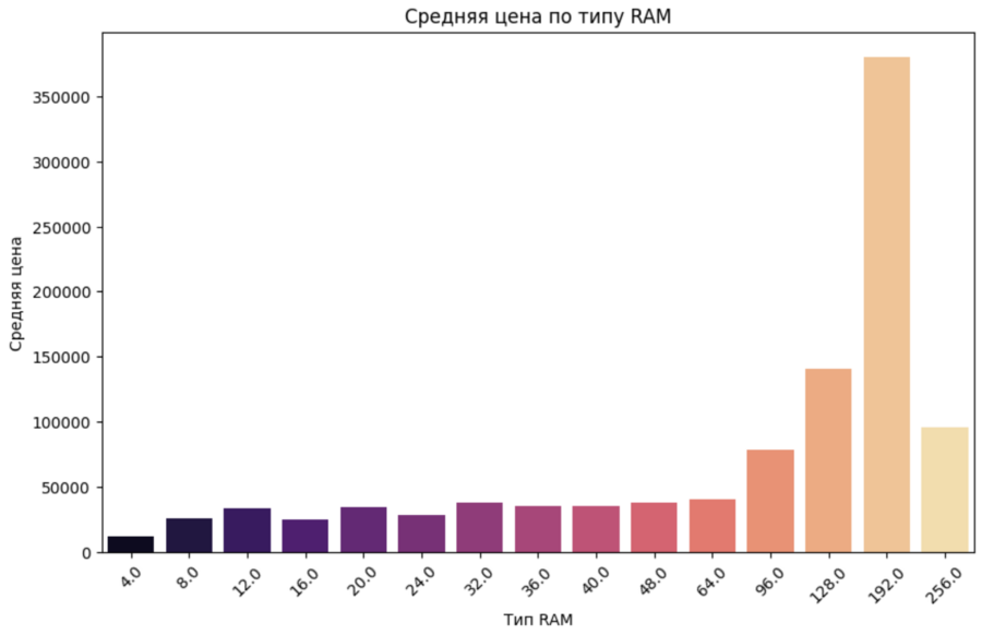 Похожая ситуация, как и с SSD у оперативной памяти, т. е. цена на RAM 192.0 выше, чем на RAM 256.0. Ещё смотря на эту гистограмму, можно заметить, что для большинства людей львиная доля RAM подходит в контексте наиболее популярного ценового сегмента.