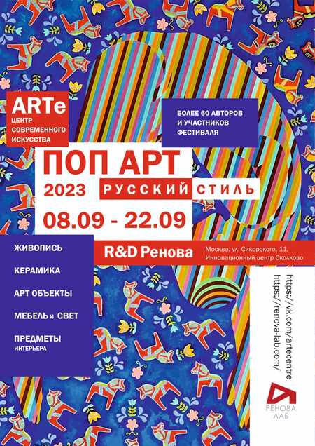 С 8 по 22 сентября 2023 года в рамках фестиваля Pop Art: русский стиль на площадке научно-исследовательского центра R& D Ренова (Москва, Сколково, Сикорского 11) авторские картины, мебель и предметы интерьера, перфомансы, экскурсии и мастер-классы для детей и взрослых с художниками и кураторами, арт-показ, открытые мастерские, на которых художники будут рисовать картины для благотворительного аукциона, сюрпризы и подарки гостям. Прикоснитесь к искусству, станьте частью истории! Регистрируйтесь бесплатно на http://popartrussianstyle.tilda.ws/!