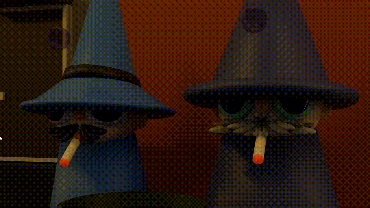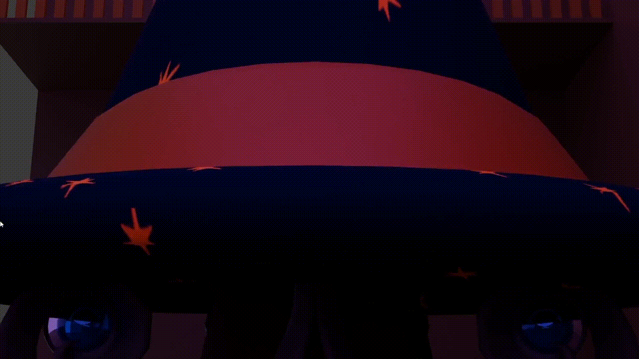 Prompt: an interior of a wizard hat shop called 'Wand & Hat Co.', burgundy wooden floor with a subtle green glow underneath, red ottoman, purple shelfs filled with colouful wizard hats, green cashier’s desk, multiple mirrors