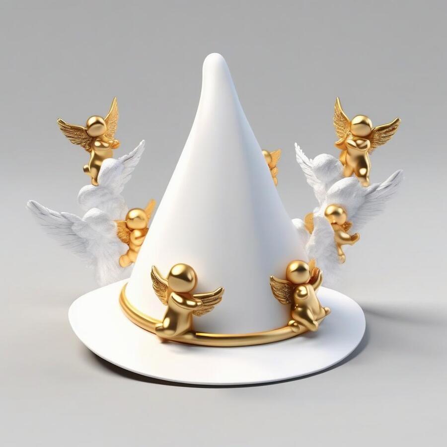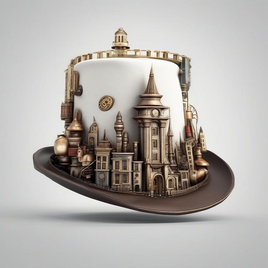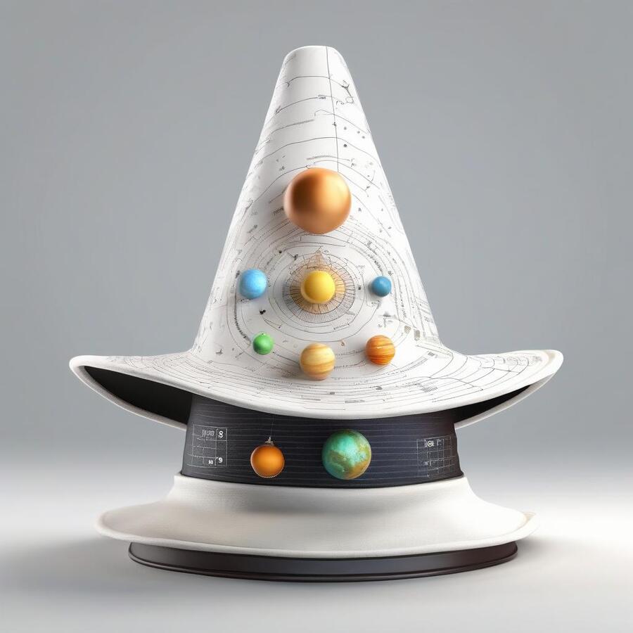 1. Prompt: wizard hat with tiny steampunk city on it, 3d render style, white backround 2. Prompt: white wizard hat with golden baby angels on it, 3d render style, white backround 3. Prompt: a green wizard hat with red fuzzy plants on it, 3d render style, white backround 4. Prompt: wizard hat with solar system scheme on it, white backround, 3d render style 5. Prompt: black wizard hat with an eyeball on it, 3d render style, white backround