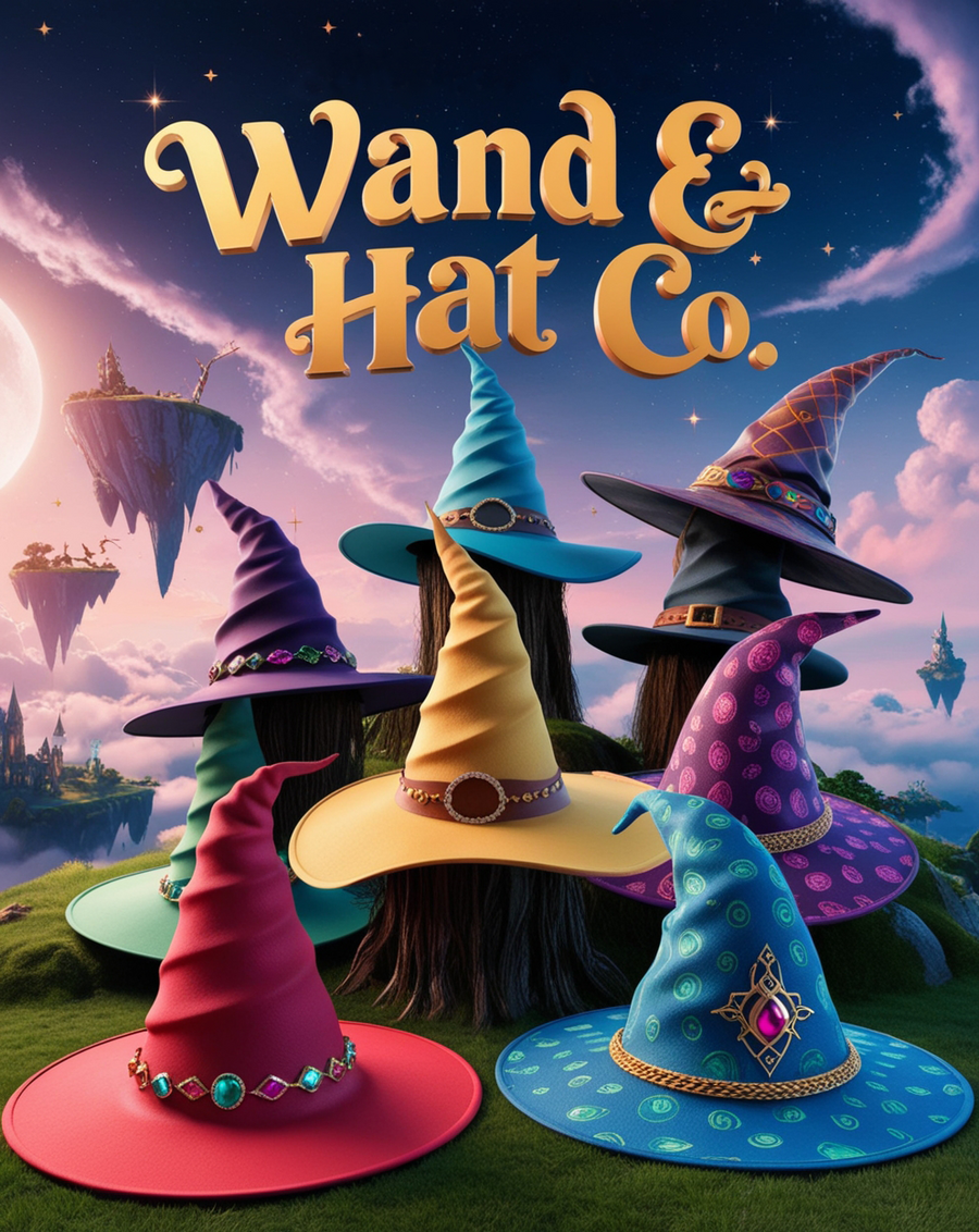2. Prompt: Create a magical and inviting promotional poster for 'Wand & Hat Co.', a specialty shop for wizard hats and enchanting accessories. The poster should feature a whimsical background, such as a fantastical landscape with floating islands or a starlit sky filled with swirling clouds. At the top, prominently display the name 'Wand & Hat Co.' in a bold, enchanting font that conveys the magic of the store. Showcase a variety of wizard hats in different styles—some adorned with jewels, others with whimsical patterns—arranged creatively throughout the design. (промпт был сгенерирован Chat GPT и детализирован Leonardo AI.)