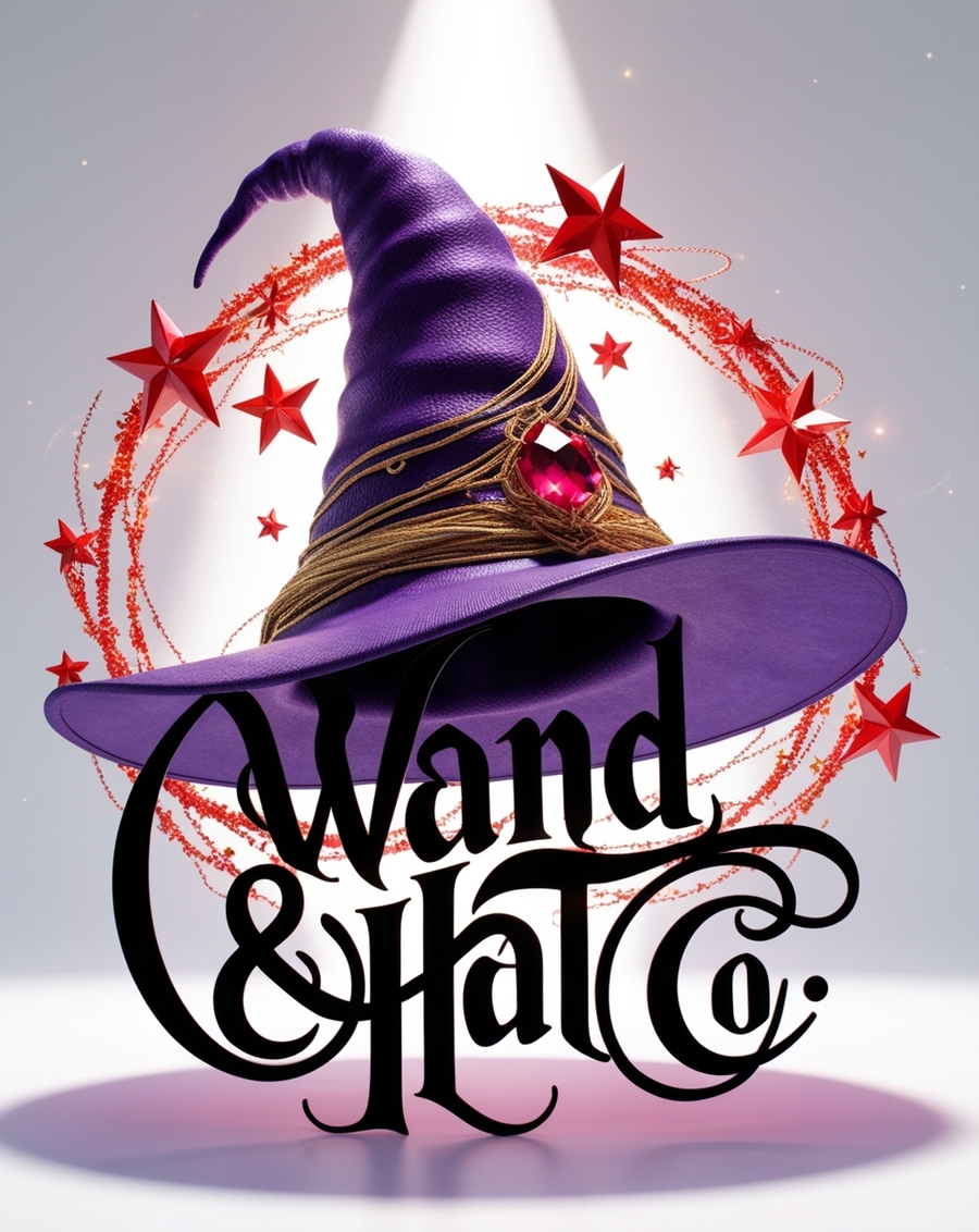 Prompt: a purple wizard hat surrounded by red stars, under it a black swirly and bold writing saying 'Wand & Hat Co., 3d render style, white backround