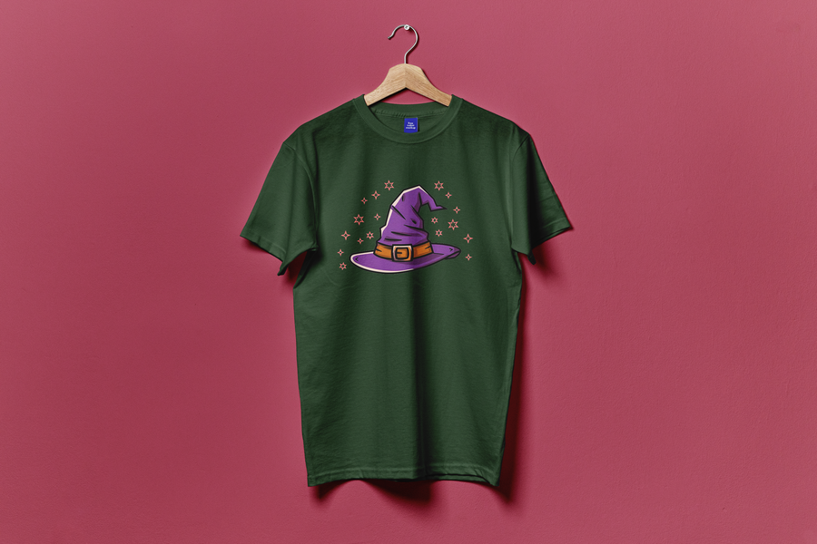 Prompt: a minimalistic vector logotype for a wizard hat shop called 'Wand & Hat Co.', 3d render style, vibrant colors, green, purple and burgundy color palette, purple wizard hat with red stars on it.