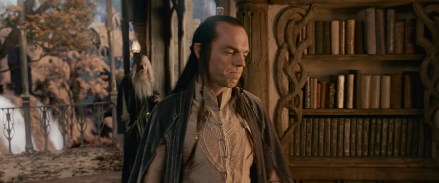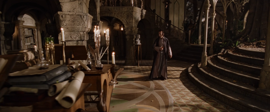 Властелин колец: Братство Кольца. Новая Зеландия, США, 2001, Питер Джексон. (Обрамление книжной полки, колонны, перила и плитка на полу).