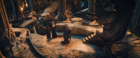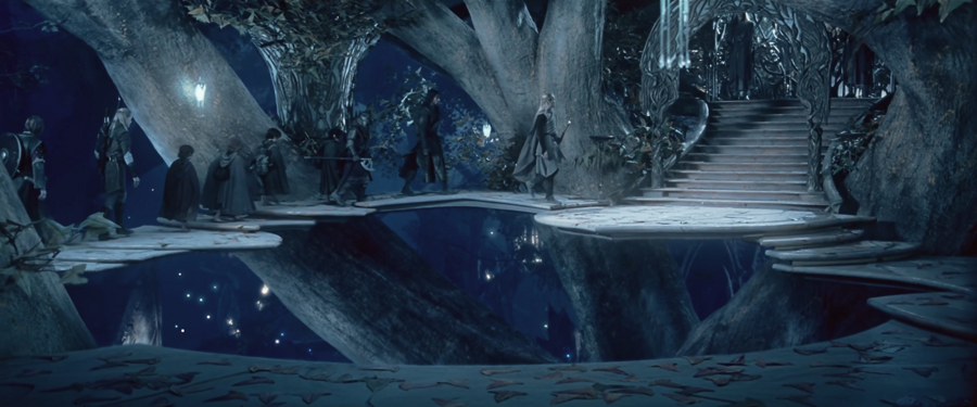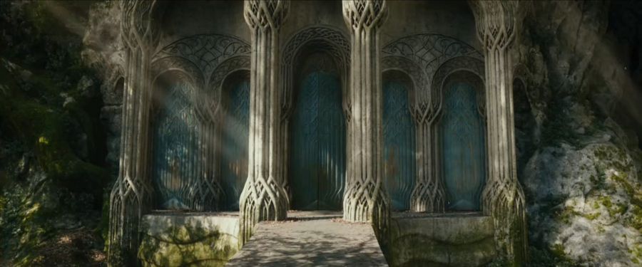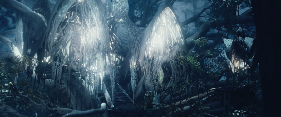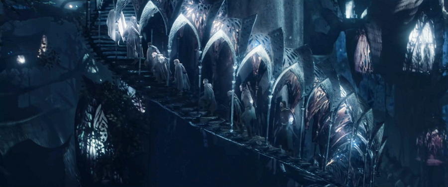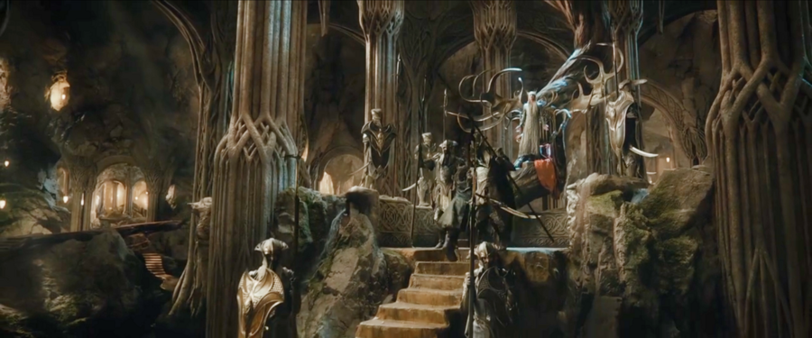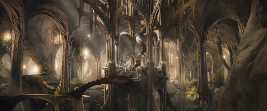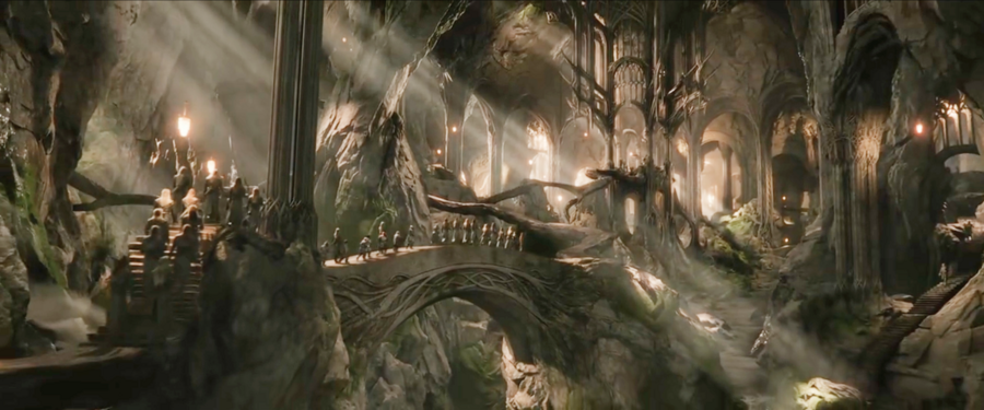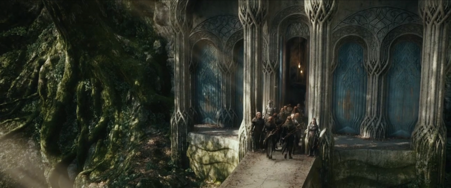 Хоббит: Пустошь Смауга. Новая Зеландия, США, 2013, Питер Джексон. (Грандиозные колонны и мостик, словно сотканные из ветвей и перетекающие в скалу).