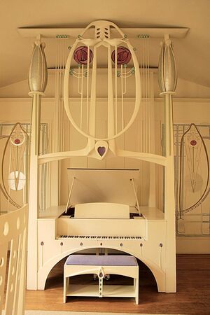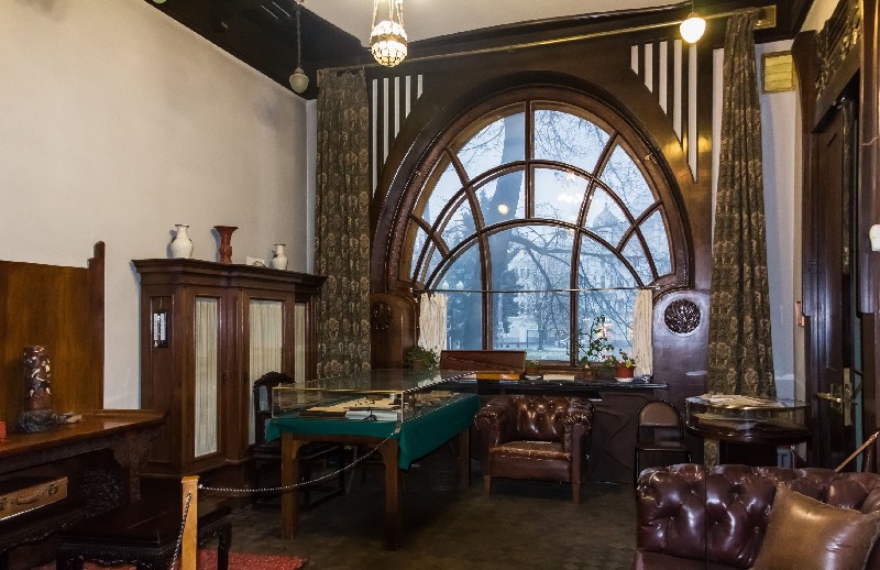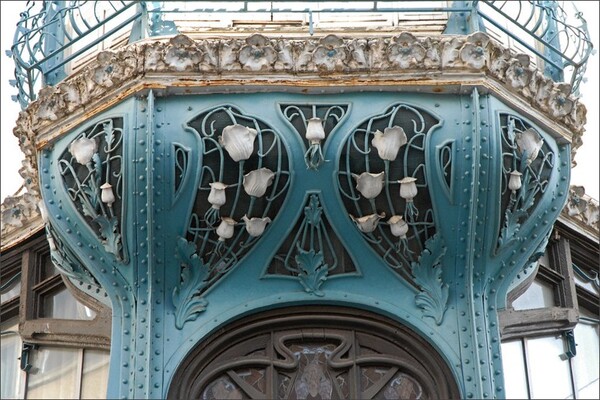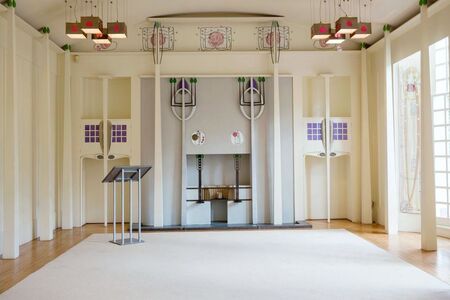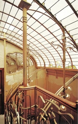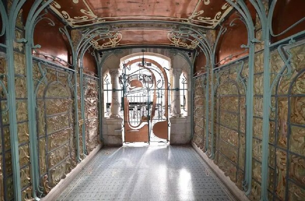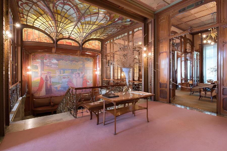 Стены и потолки украшены резьбой и орнаментами, создающими ощущение, будто пространство выросло из самой природы. Использование натуральных материалов или их имитаций также характерно для модерна, где важна была гармония между архитектурой и окружающей средой.