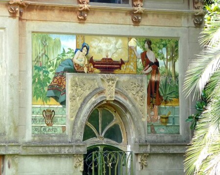 Нельзя пройти мимо оформления фрески. Её обрамляют колонны и декоративные панели, украшенные сложной резьбой с переплетающимися растительными и геометрическими мотивами, напоминающими кельтский орнамент и характерные линии модерна. Изогнутые, текучие формы, плетёные узоры, плавные переходы — всё это визуально связывает архитектурные элементы с природой, что является одной из отличительных черт ар-нуво. В модерне подобные мотивы выступают не только как украшение, но и как символ вечной жизни, цикличности, гармонии с окружающей средой.