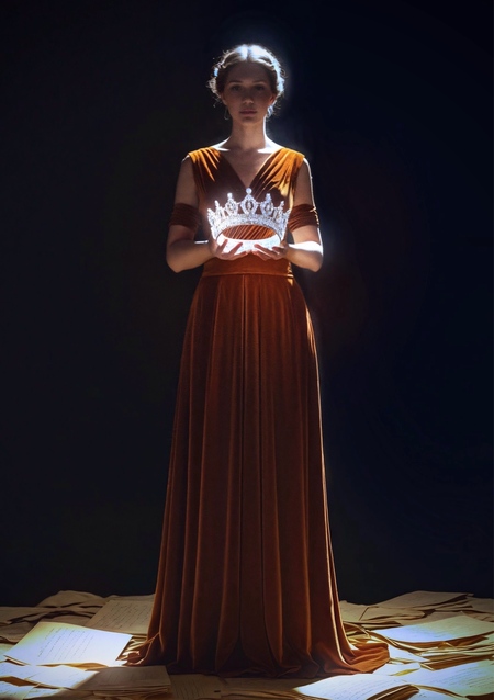 Женская фигура в вельветовом драпированном тёмном апельсинового цвета платье стоит фронтально. Платье до пола закрывает всё тело кроме рук. Руки ниже локтя открыты, в руках женщина держит массивную бриллиантовую диадему. Мы видим тело женщины лишь ниже плечей. Женщина стоит на чёрном фоне, свет контурно подсвечивает её. На диадему в руках женщины падает пучок света, освещающий её. Пол застелен хаотично раскиданными листами рукописей чуть желтоватого цвета.