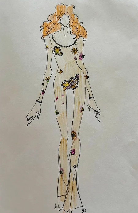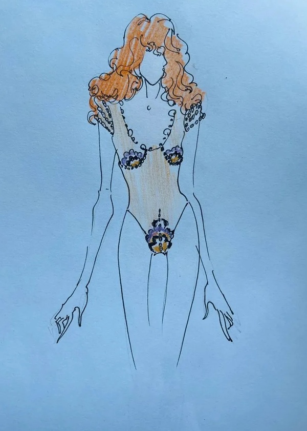 2021 Разработка костюма для клипа Муси Тотибадзе. За основу взяли телесную сетку — материал, который используют в гимнастических купальниках. Главными референсами стали «love-парады, Берлин 1990-х и дух свободы, который над всем этим витает, а вся вышивка на костюме рождалась непосредственно в процессе работы» [источник].