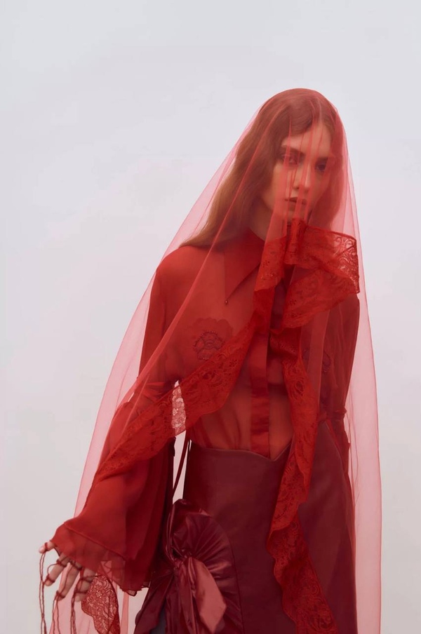 «Превращение», ss2022 Вдохновленная произведением Франца Кафки коллекция отражает тему абсурдного и инородного мира. Включает кружевные кроп-топы, рубашки с оборками из разных тканей, пиджак с кроше-цветами, кроваво-красную фату с кружевом и вручную связанными аксессуарами. Некоторые вещи создавались без эскизов, медитативно собираясь из кусочков ткани.