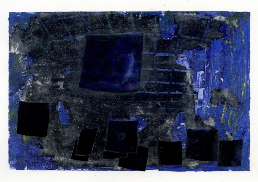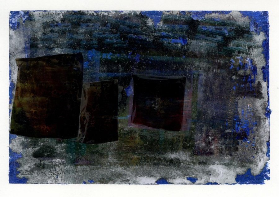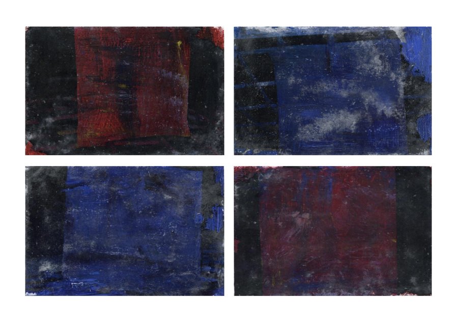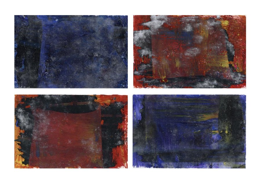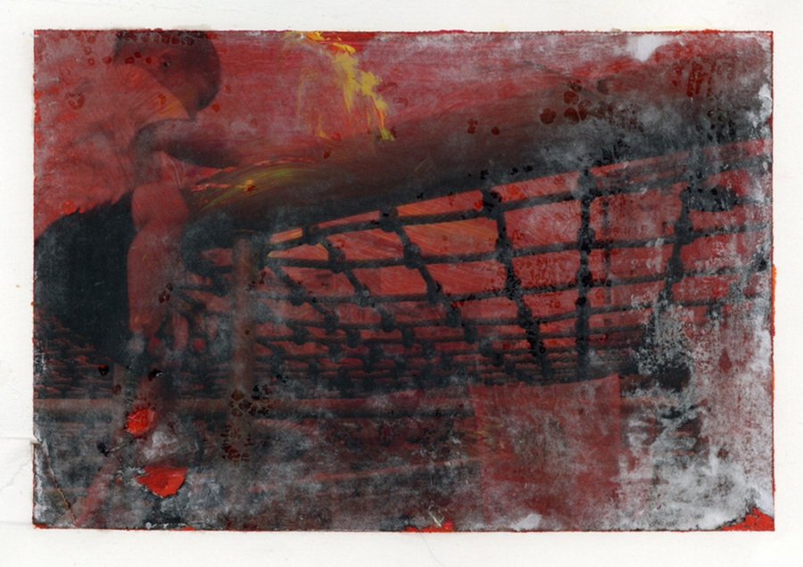 Images were transferred via acrylic gel onto watercolor paper. Cracks formed during curing mirror memory’s inherent fragmentation—material traces of psychological rupture.