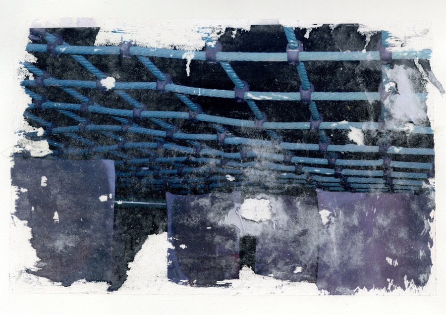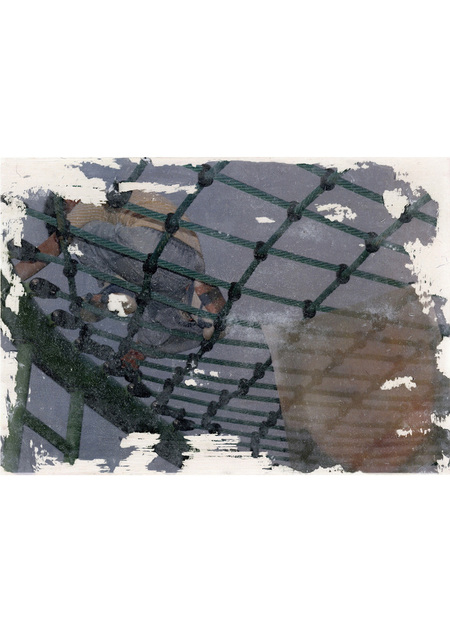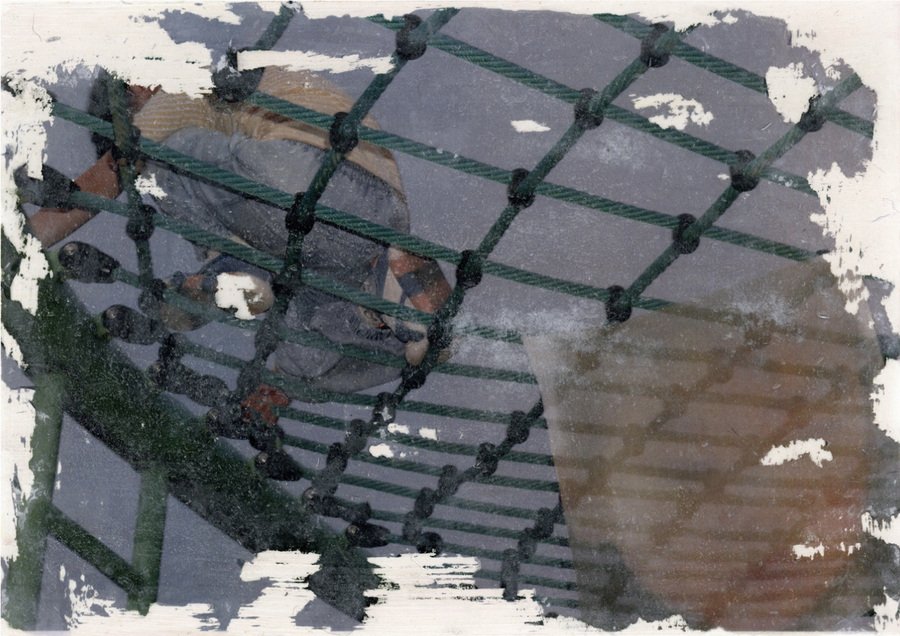 图像通过转印工艺实现:将童年照片印于丝绸纱布,在攀爬网下拍摄后,用丙烯凝胶转印至水彩纸。凝胶固化时的自然裂痕,呼应记忆重构中的断裂与创伤。这些裂痕既是材质反应,也是锚定童年经验时的精神褶皱。