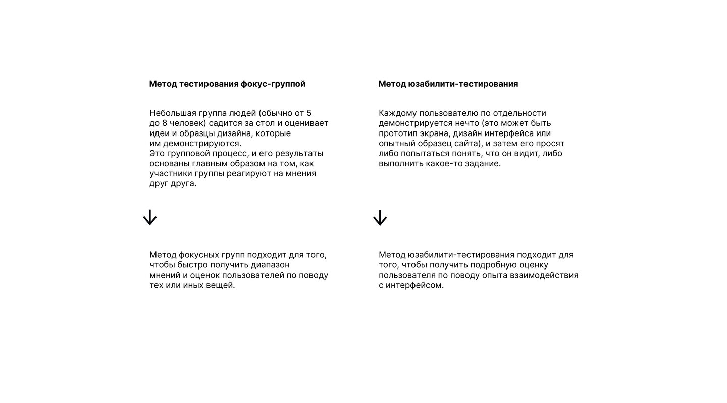 Чтобы объект получился понятным и удобным в использовании, необходимо провести тестирование интерфейса, которое поможет выявить недостающие или сложные моменты в коммуникации с пользователем. Существует два метода тестирования — метод фокусных групп и юзабилити-тестирование.
