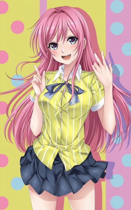 Промт для создания обложки в ideogram.ai: A 2D anime-style medium shot of a schoolgirl with long pink hair. She is wearing a bright yellow and white striped shirt and a dark blue skirt. The girl is smiling and showing two fingers. The background is a bright yellow wall with pink and blue polka dots. The overall image is in the bright yellow, pink, blue, and purple color scheme. Промт замка: A 2D anime-style landscape with a bright yellow, pink, blue, and purple color scheme. There’s a pink castle with blue towers and a purple door. The castle is surrounded by a yellow wall. There’s a blue bridge leading to the castle. The background contains a purple mountain range with blue skies and pink clouds.