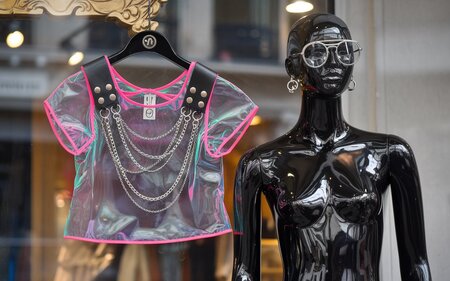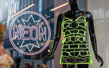 Промпт: a neon short dress with leather chains hangs on a mannequin. The mannequin is black lacquered, has piercings and glasses. A mannequin stands on a shop window.