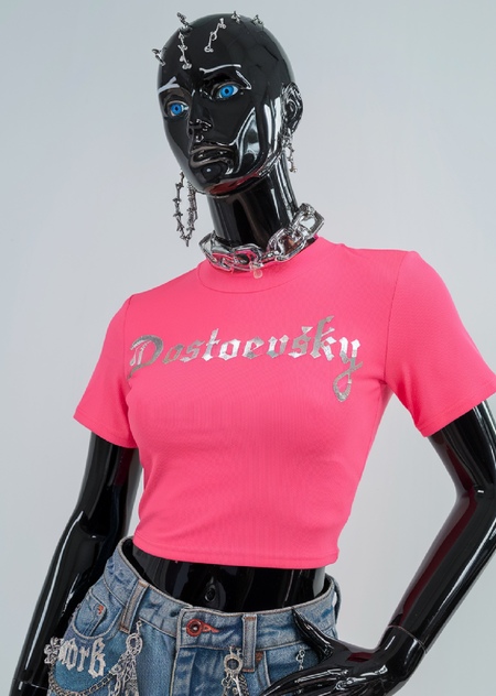 Промпт: advertising posters in the subway on a dark brick wall. The posters advertise bright clothes in neon colors, the clothes are shiny or leather, they are on black lacquered mannequins. The poster says «DOSTOEVSKY»