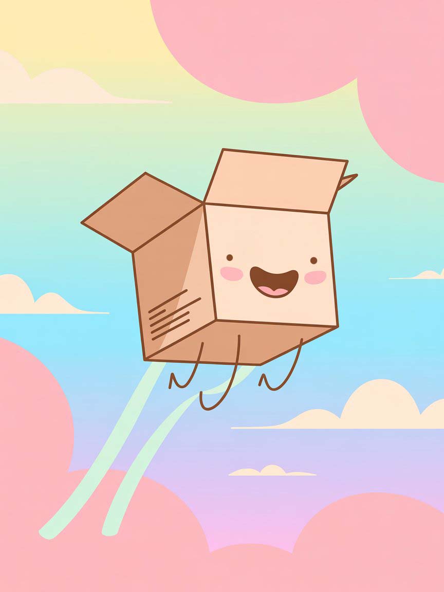 «A cardboard box with a cute face flying up in the sky. Cute minimalistic illustration in soft colors»