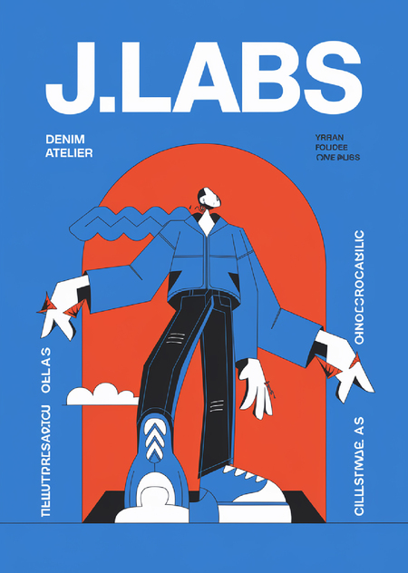 prompt:/Creative promotional materials for J.LABS, featuring posters and social media ads that highlight the brand’s vibrant, youthful energy. The designs use bold typography, contrasting colors of blue, orange, white, and black, and dynamic compositions that appeal to a young, adventurous audience. The imagery focuses on the crafting process, close-ups of denim textures, and young people wearing custom jeans. The style is modern and edgy, exuding creativity and freedom