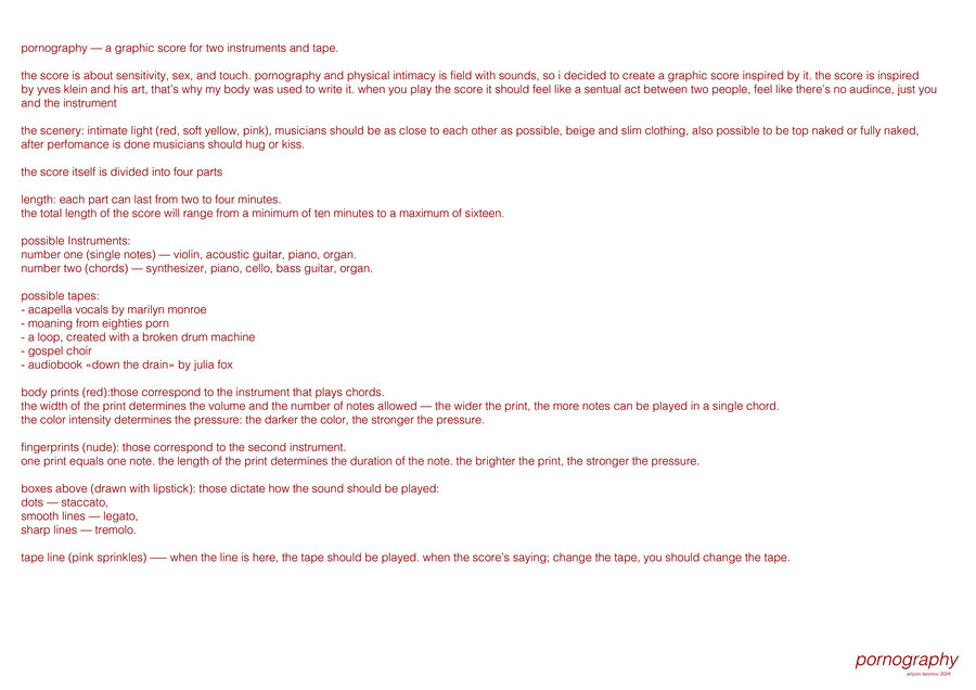 pornography — графическая партитура о сексе, телесности, влечении, романтике и физическом удовольствии. Это партитура созданная телом, цветом и человеческим теплом. Вдохновлена творчеством Ива Кляйна и написана для 2 инструментов и тейпа, разделенная на 4 части.