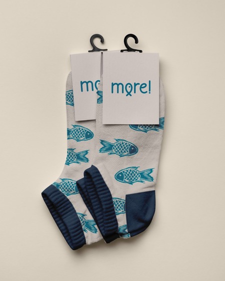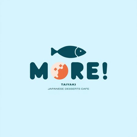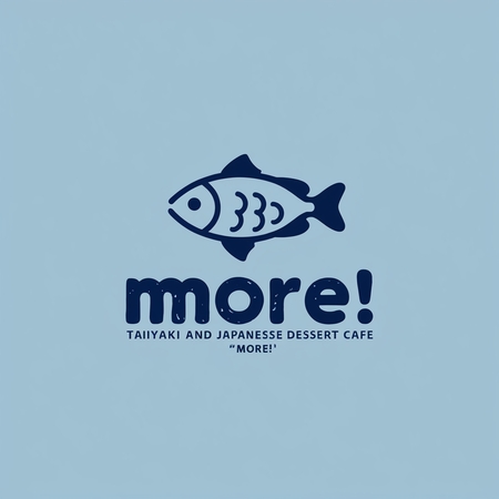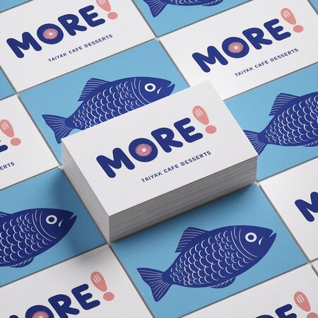 An identity design of taiyaki and japanese desserts cafe «more!». The logo, colour scheme and typography are simple. There is a simplified fish in the logo. The texture is slightly shabby, as if the prints were made by hand. The colours are soft, the main color is blue.