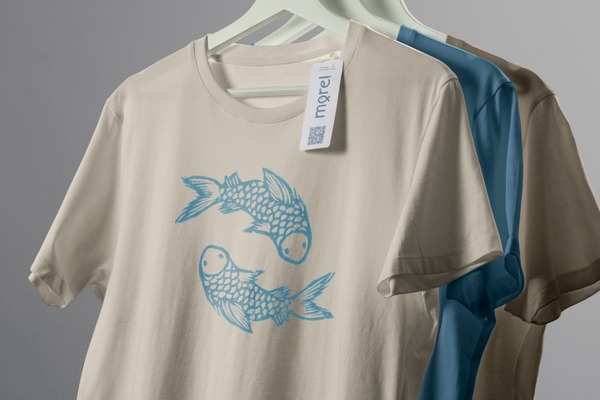 A 3D model mockup business card design for taiyaki cafe and japanese desserts «more!». The design is based on fish prints in blue colours. The texture is slightly shabby, as if the prints were made by hand. The colours are soft.