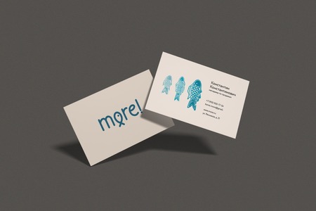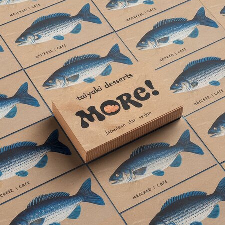 A 3D model mockup business card design for taiyaki cafe and japanese desserts «more!». The design is based on river fish prints in blue colours such as mackerel, perch, zander, sprat and others. The texture is slightly shabby, as if the prints were made by hand. The colours are soft.