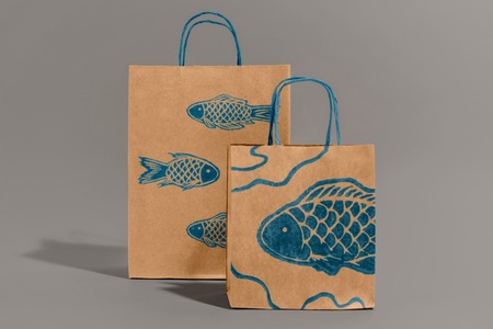 3D model mockup of bag for taiyaki cafe and japanese desserts «more!». The design is based on river fish prints in blue colours such as mackerel, perch, zander, sprat and others. The texture is slightly shabby, as if the prints were made by hand. The colours are soft. The background behind the package is blurred.