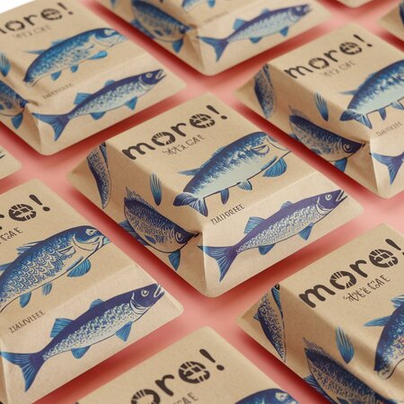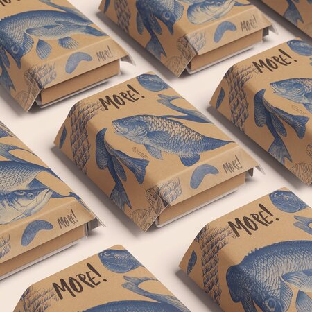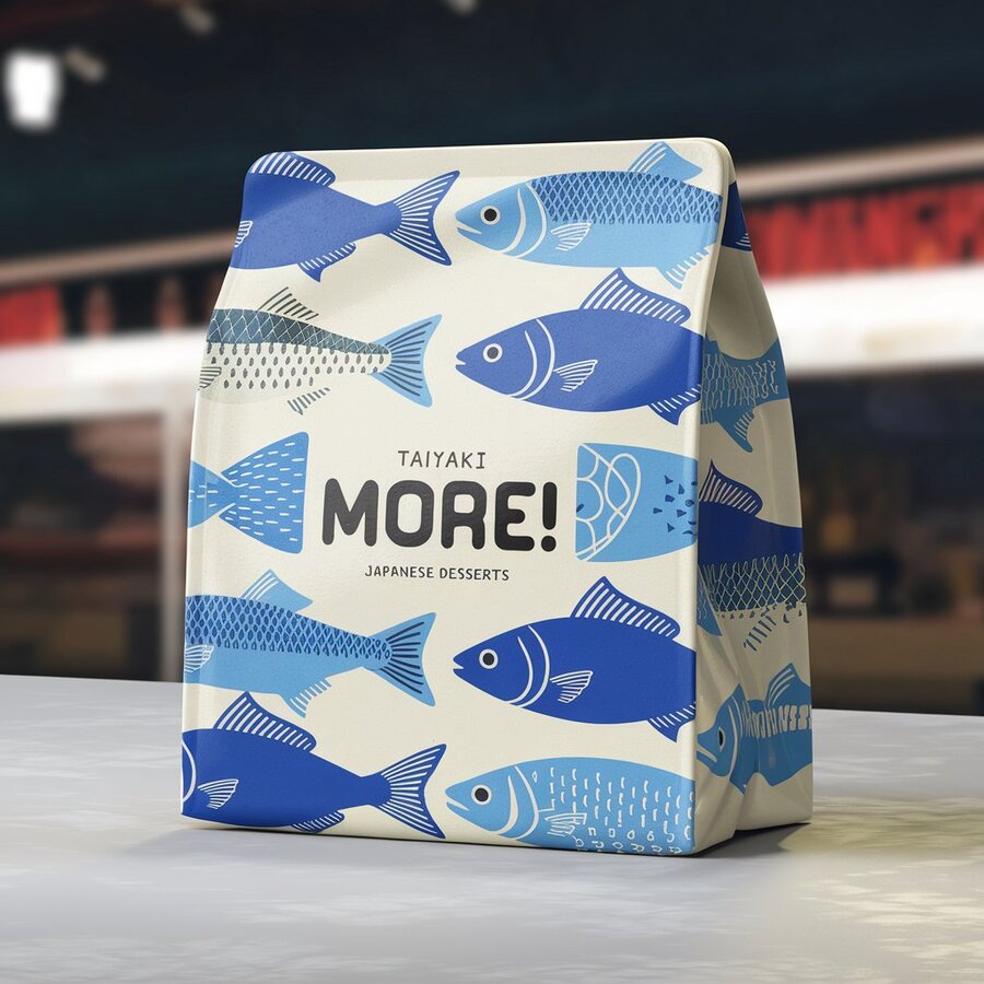 3d models of takeaway packages for taiyaki cafe and japanese desserts «more!». The design is based on river fish prints in blue colours such as mackerel, perch, zander, sprat and others. The texture is slightly shabby, as if the prints were made by hand. The colours are soft.
