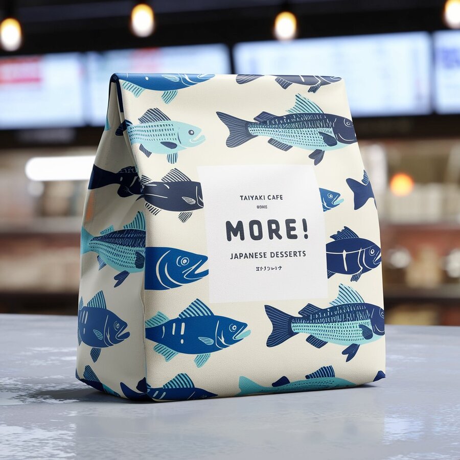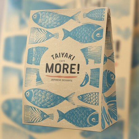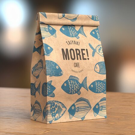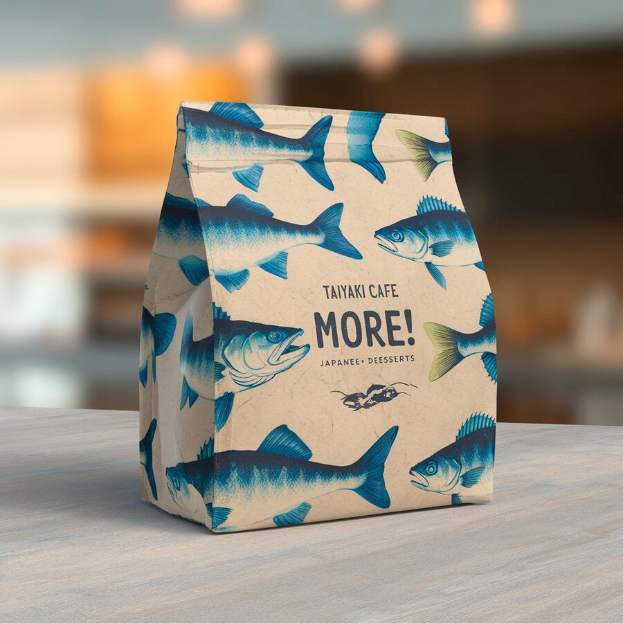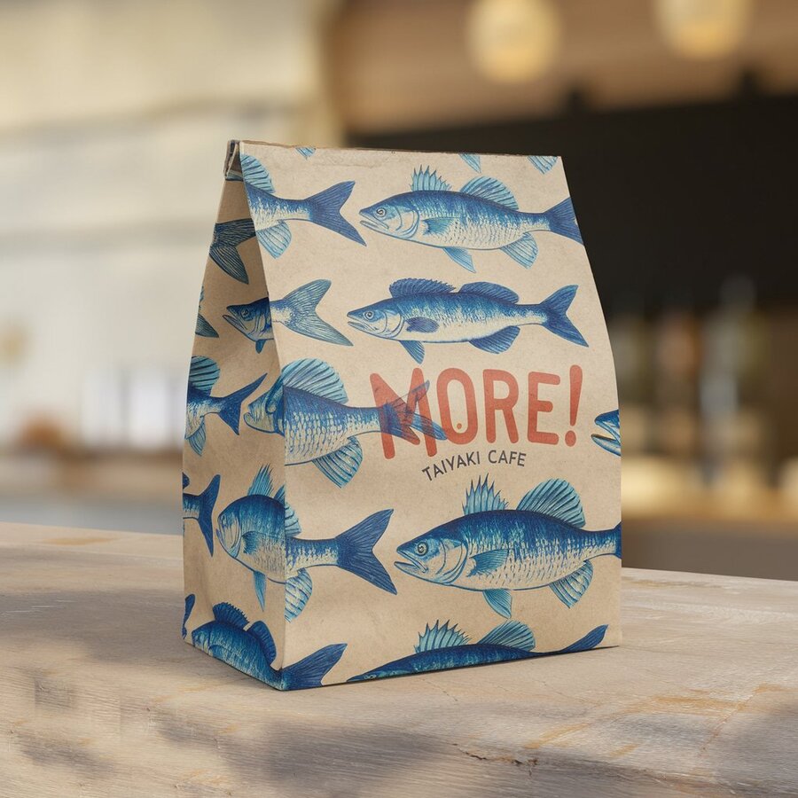 3D model mockup of kraft paper bag for taiyaki cafe and japanese desserts «more!». The design of the bag is based on river fish prints in blue colours. The texture is slightly shabby, as if the prints were made by hand. The colours are soft. The background is blurred. (пакет ниже — такой же промпт)