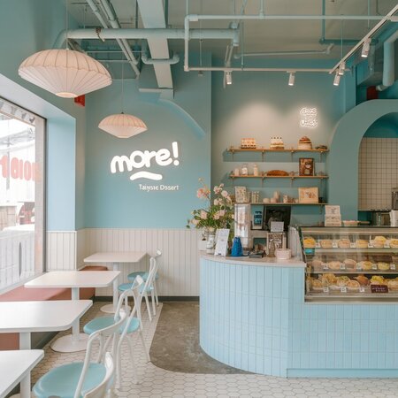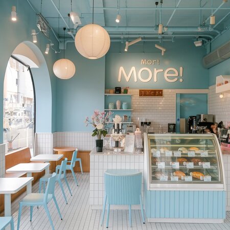 The interior of a taiyaki and Japanese dessert cafe «more!». Soft blue shades, soft brown/grey, blue, white are used, bright accents are rare. There are some Japanese cultural elements.