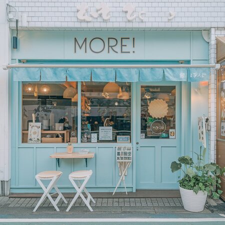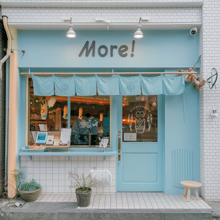 The exterior of a taiyaki and Japanese dessert cafe «more!». Soft blue shades, soft brown/grey, blue, white are used, bright accents are rare. There are some Japanese cultural elements.