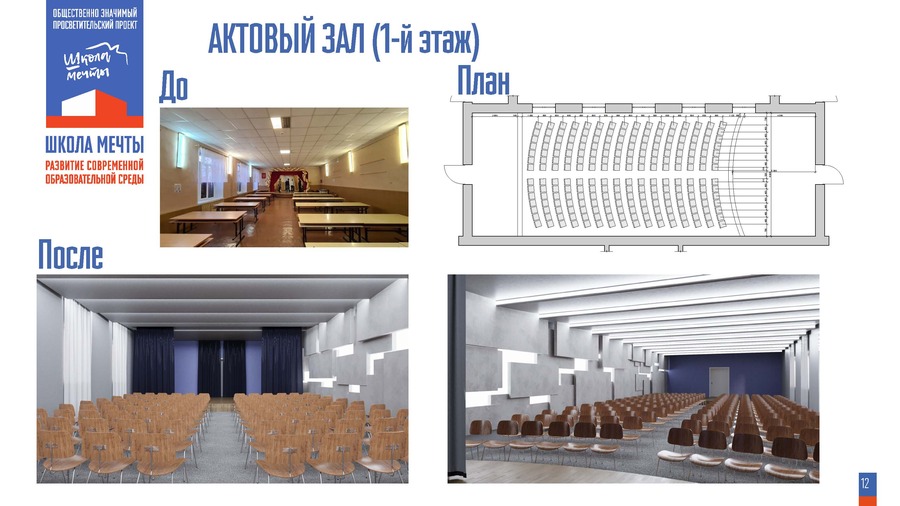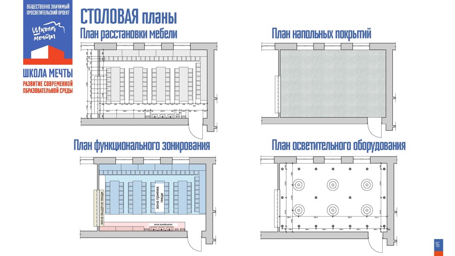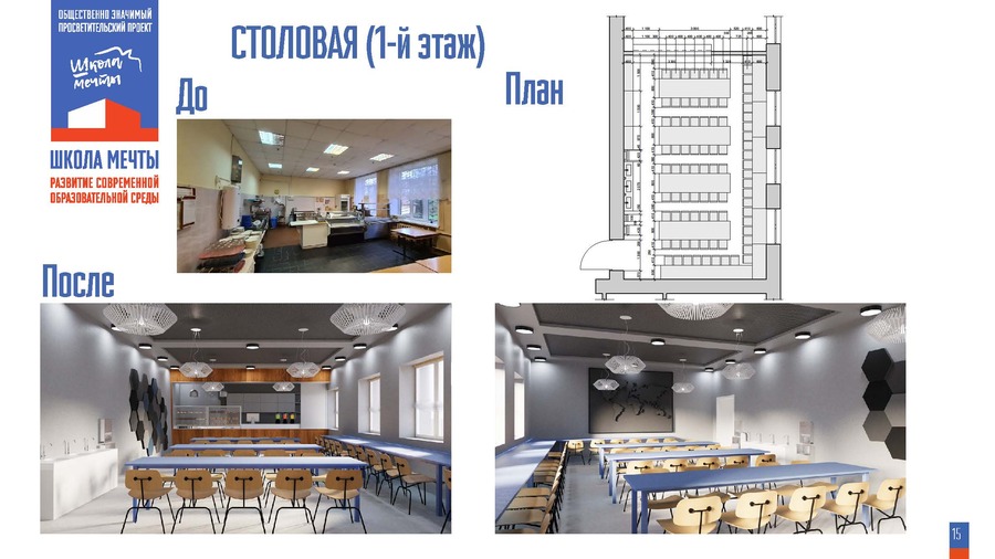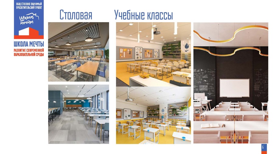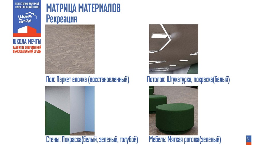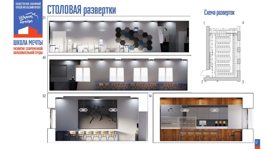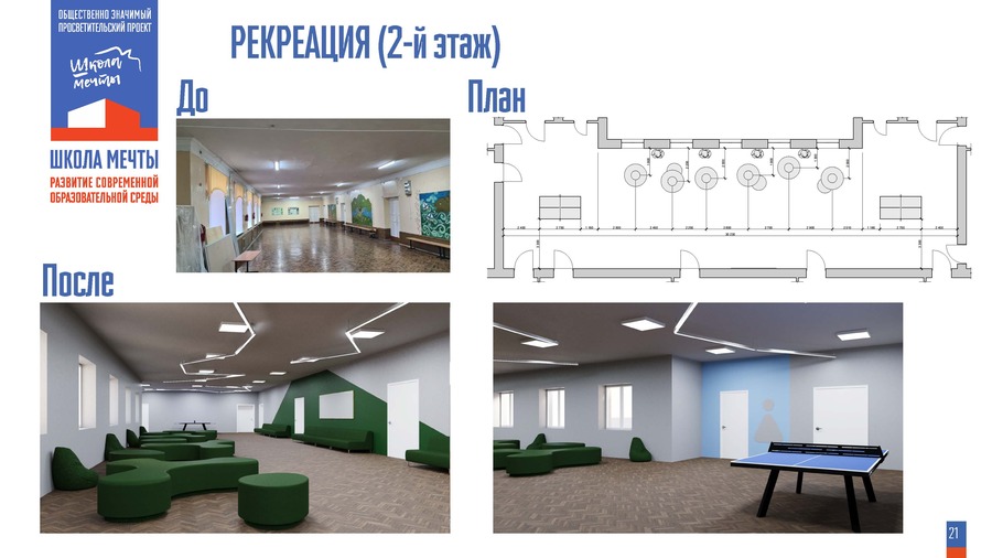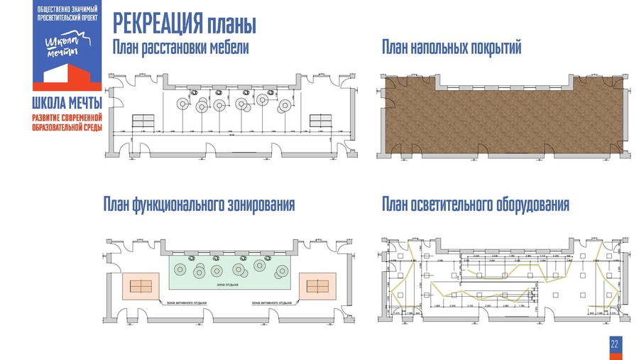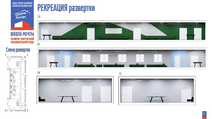При проектировании интерьеров были учтены главные пожелания учеников и учителей школы № 9, такие как: расширение столовой, улучшение актового зала и его изоляция от функции приема пищи, добавление мягко мебели в рекреациях, яркие цветовые решения в кабинетах.