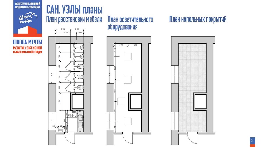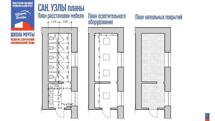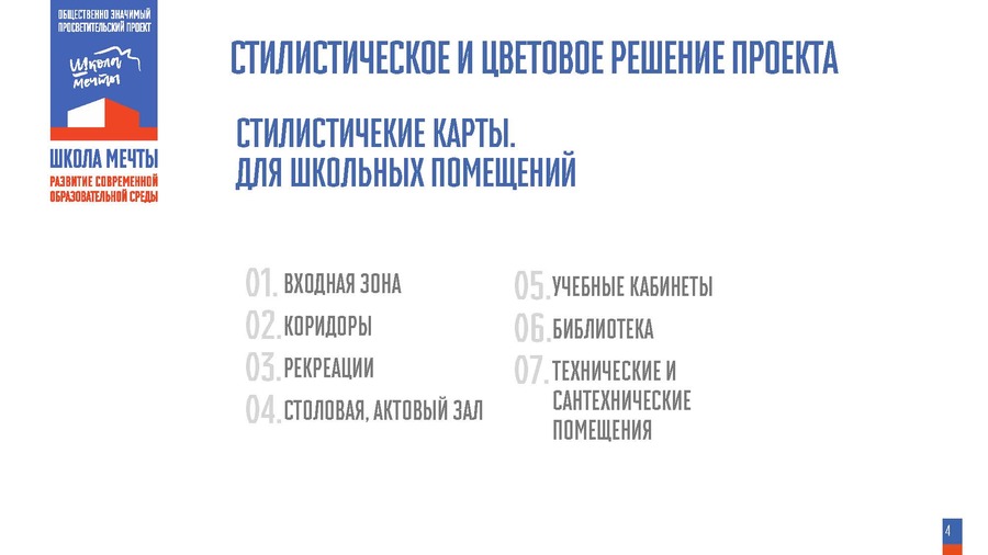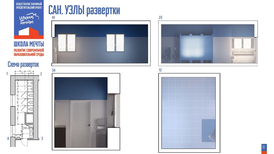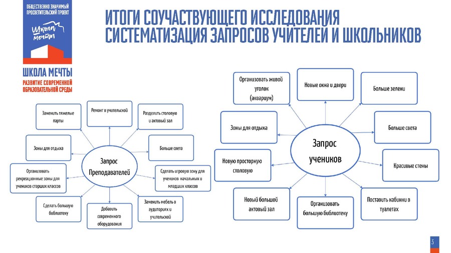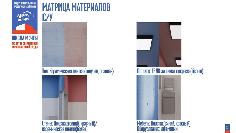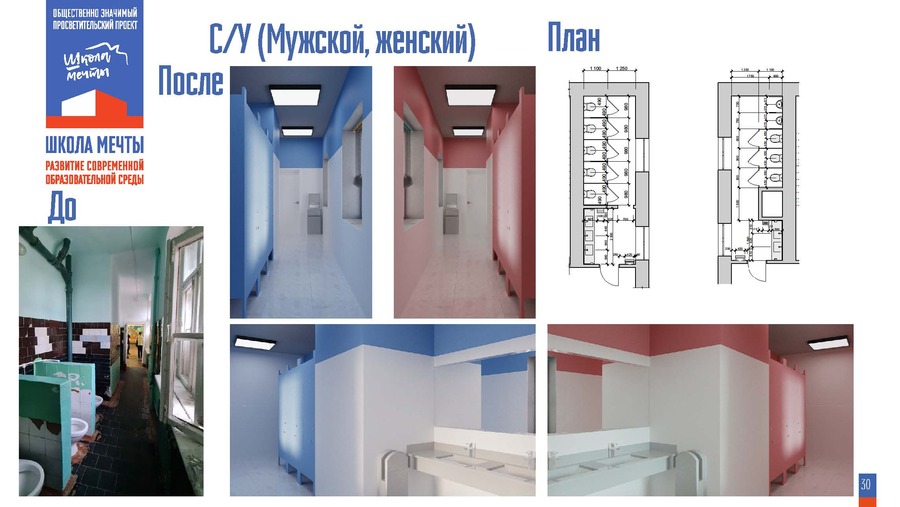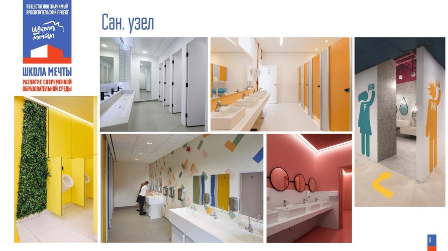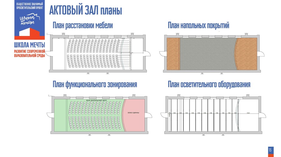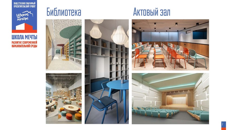 При проектировании интерьеров были учтены главные пожелания учеников и учителей школы № 9, такие как: расширение столовой, улучшение актового зала и его изоляция от функции приема пищи, добавление мягко мебели в рекреациях, яркие цветовые решения в кабинетах.