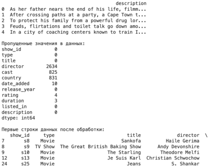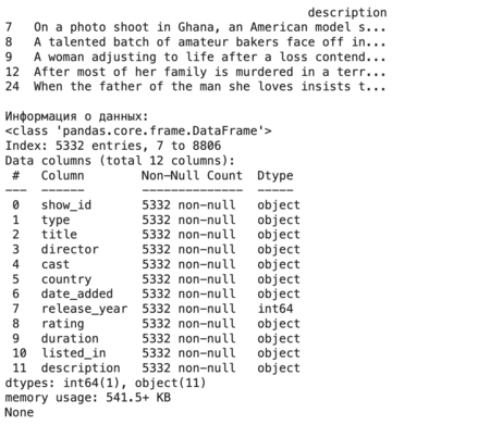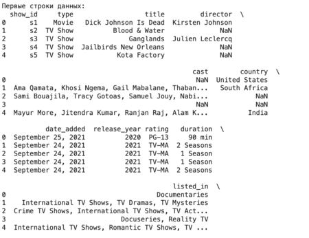 Для начала я импортировала необходимые мне библиотеки: pandas. После чего считала скачанный csv-файл датасета и провела предварительный анализ