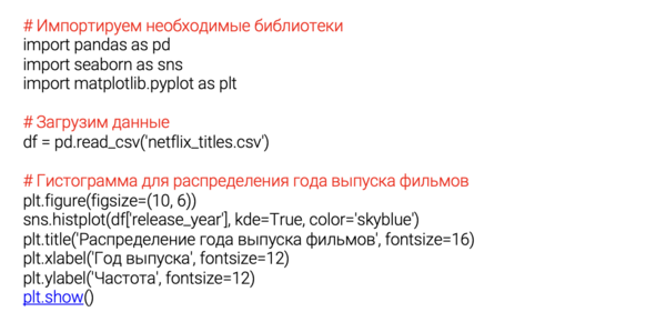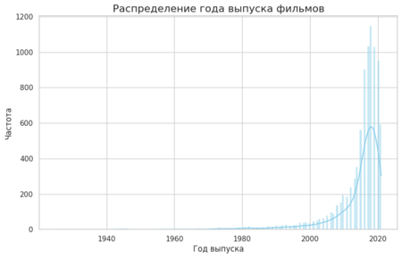 Гистограмма отображает количество фильмов, выпущенных в каждый год. На оси X отложены годы, а на оси Y — частота, то есть количество фильмов, выпущенных в соответствующий год.