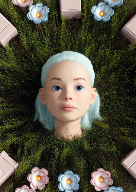 Stunning hyper-realistic 3D render in octane, a minimalistic cartoon world, where pastel-colored plastic flowers grow around, grass around, and boxes of cosmetics grow around. View from above.