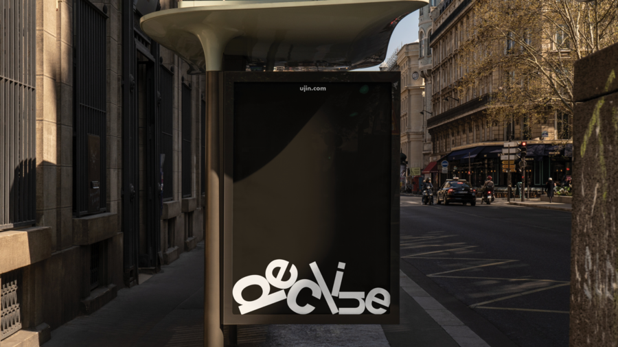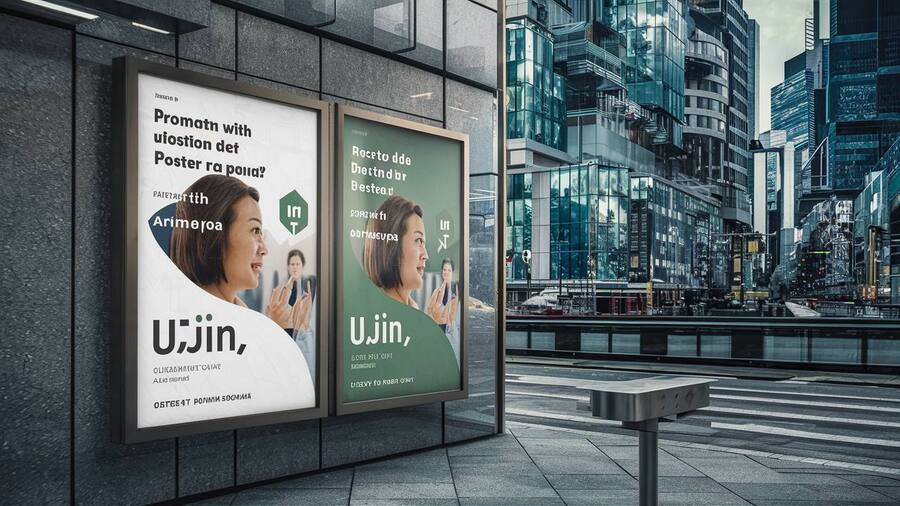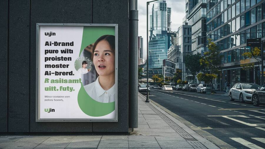 Hyper realistic photo mockup of a poster on the wall in a modern city, on the poster advertisement for Ai-brand «UJIN», on the poster a woman speaking with Ai-Assistant