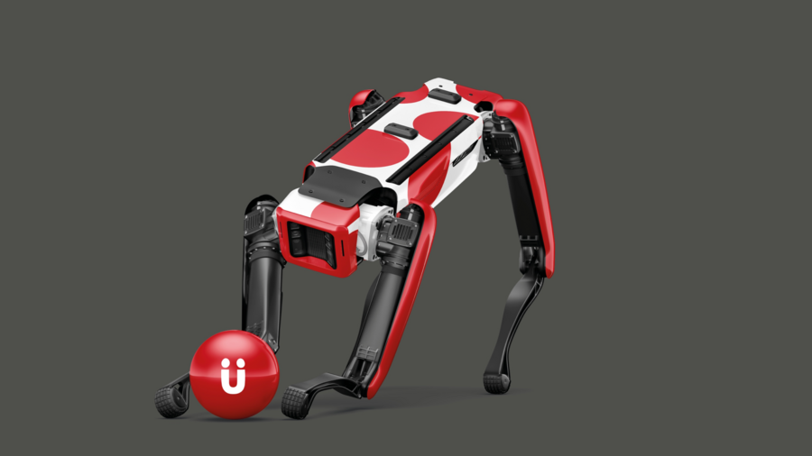 a 3D advertisement for Ai-brand «UJIN», a lot of dog type robots walking on the grass, and only one is watching on camera, 3D rendering, octane rendering, white and green colors