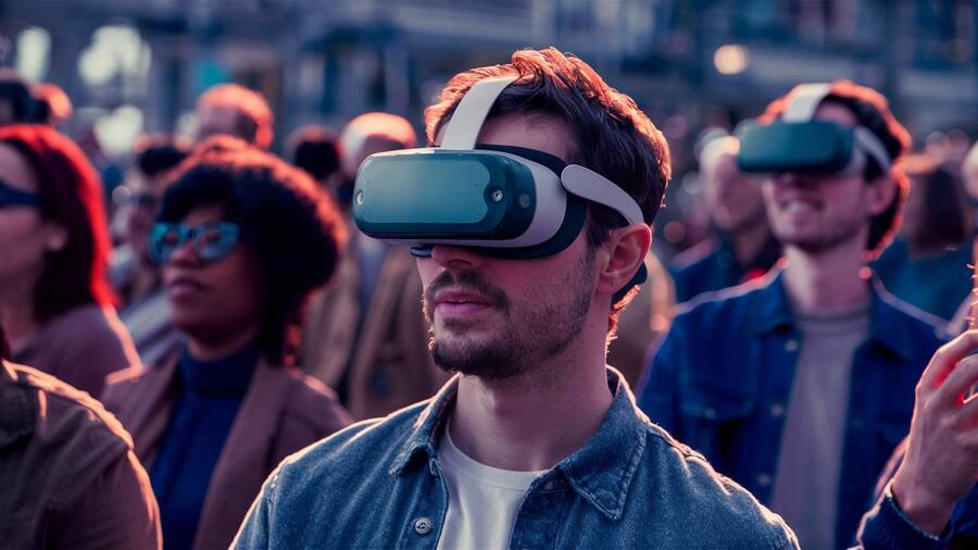 People in the crowd wearing a VR full face glasses, made of glass and metal, white and dark-green colors, 3D rendering, octane rendering, hyper-realistic