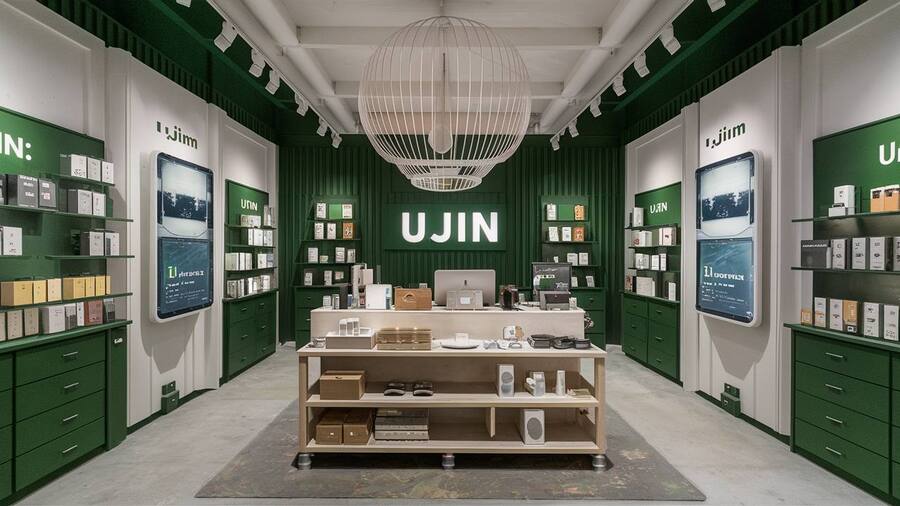 A hyper realistic photo of a corner store of Ai-tools, the name of brand is «UJIN» white and green colors, clean look, modern design, 3D rendering, octane rendering